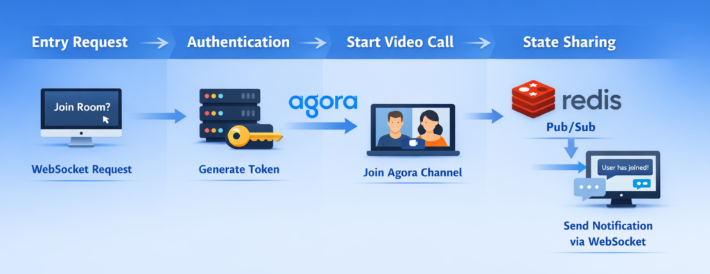 - 入室準備:フロントが WebSocket で自前サーバーに「入室したい」とリクエスト