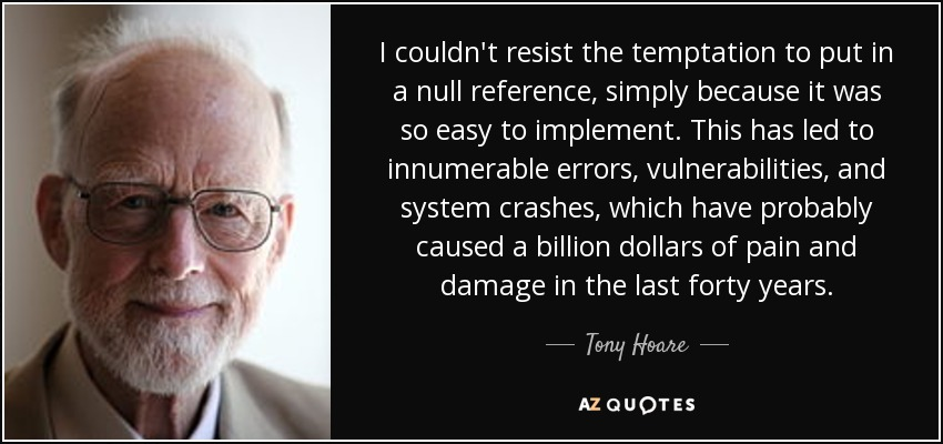 null参照の概念を発明した、Tony Hoare本人が「私の失敗で10億ドル損させた」って本人が言っている。関数型やnull安全を備えた言語は、NULL参照のバグを起こしにくくする。